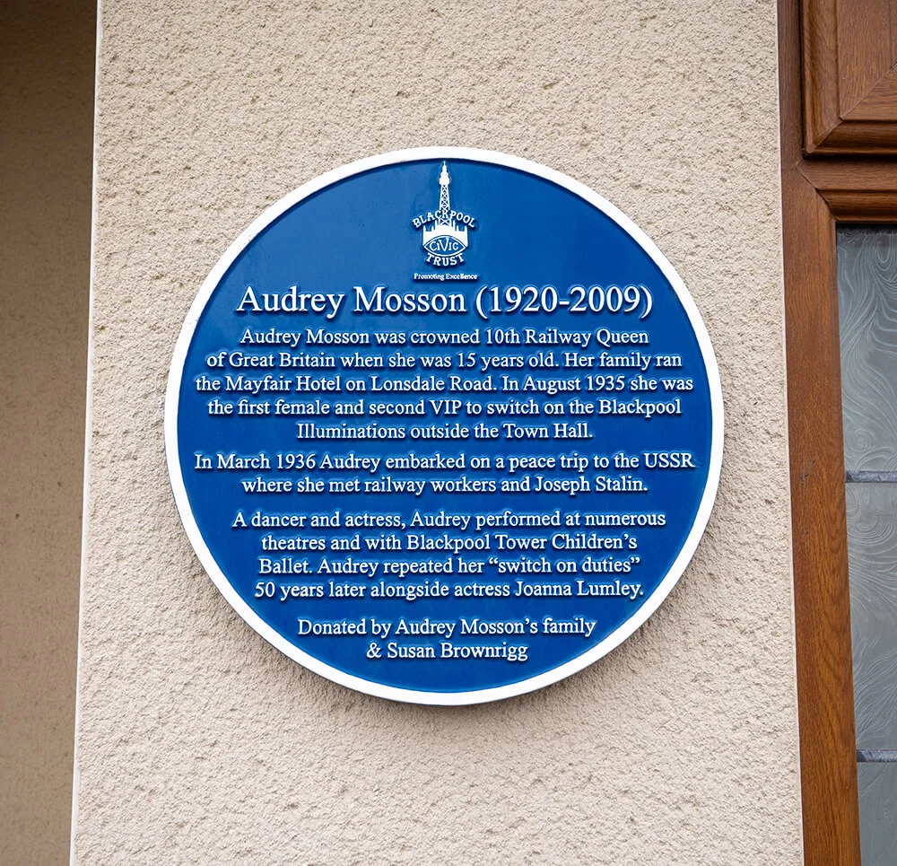 A blue plaque was unveiled on 20 May 2023 at Audrey’s former home, 2a Lonsdale Road, Blackpool. Donated by her family and researcher Susan Brownrigg, it honours her achievements and lifelong connection to Blackpool — a town that celebrated her both as a performer and as a symbol of its bright, enduring spirit.