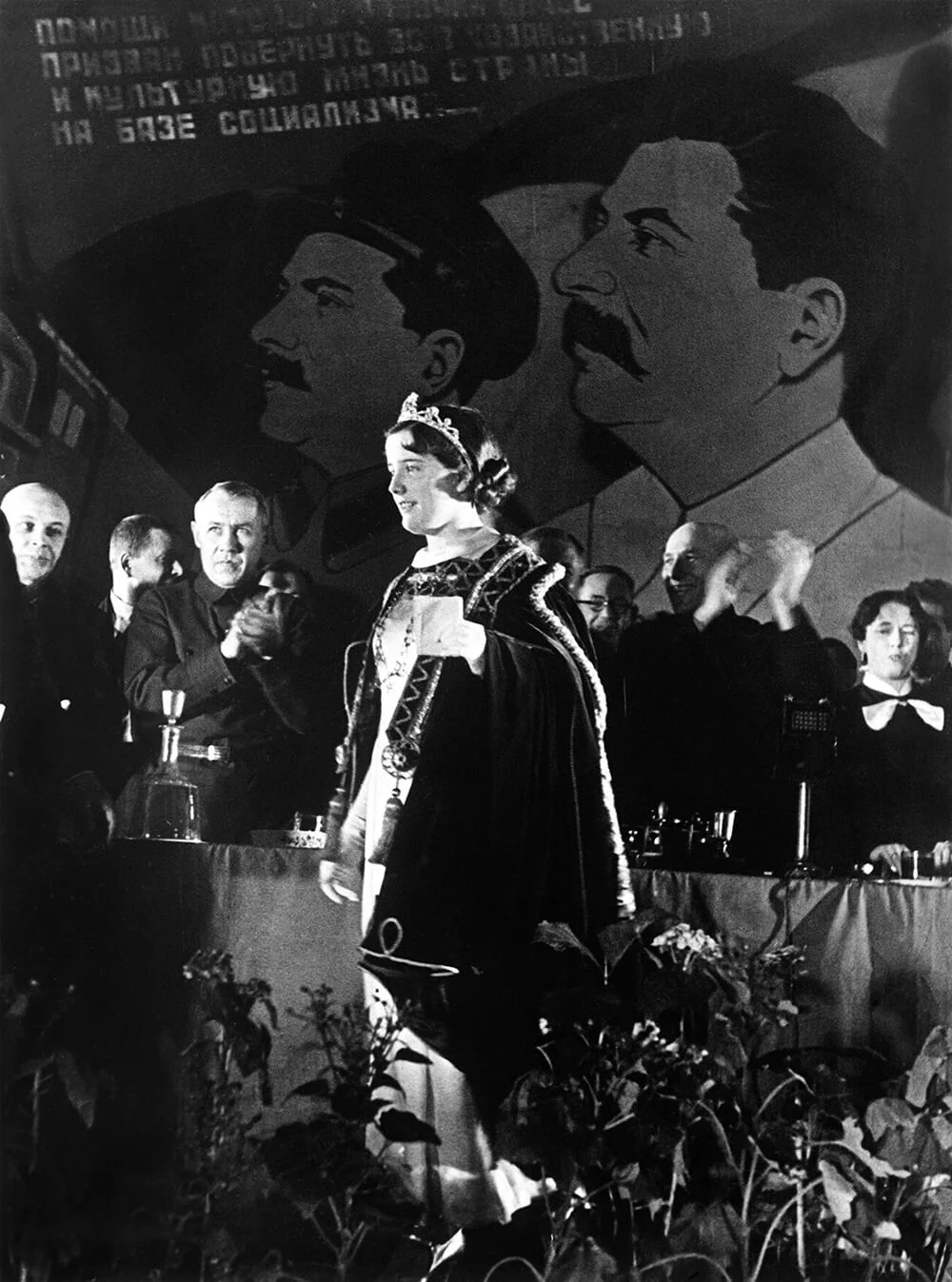 British railway Queen receives ‘Link of Peace’ in Moscow. A ‘Link of Peace’, in the form of a railway coupling, for her chain of office was presented to the British Railway Queen, 15 year old Audrey Mosson of Blackpool, on behalf of Russian railwaymen at the Railway Worker’s club in Moscow. The Queen, who is on a goodwill visit to Soviet Railway workers, has been received by members of the Soviet Government. Photo shows, Russian railway chiefs applauding the British Railway Queen at the ceremony. 17 March 1936. © Alamy