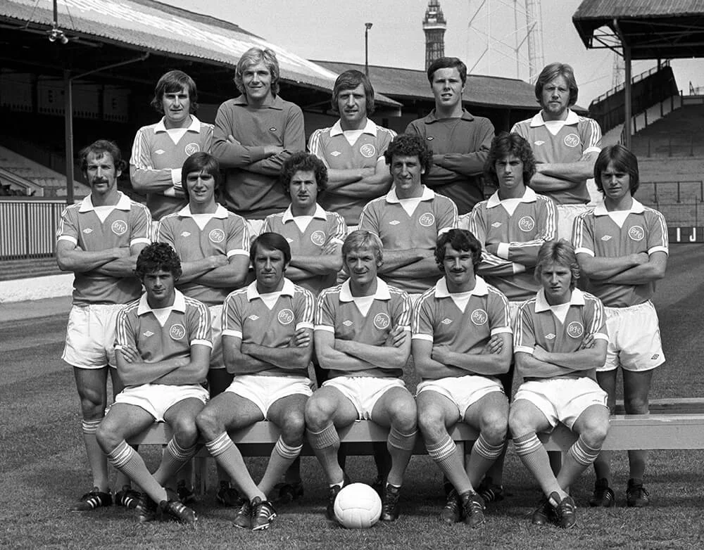 G40DPR Blackpool team group. (Back row, l-r) Terry Alcock, George Wood, Bill Bentley, Colin King and Alan Ainscow. (Middle row, l-r) Rob Hatton, Steve Harrison, John Curtis, Paul Hart, Stan McEwah and David Tong. (Front row, l-r) Kevin Moore, Alan Suddick, Peter Suddaby, Michael Walsh and Billy Ronson