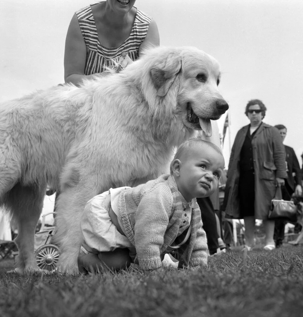 In the photo below, Baby Peterjon steals the spotlight from Zodie, a Pyrenean Mountain Dog, during the Blackpool Dog Show on 2 June 1966. Zodie was owned by Freddie Garrity, of Freddie and the Dreamers. Peterjon Phillips, from Mold, Wales, was the baby featured, with his mother caring for the dog on Freddie’s behalf.