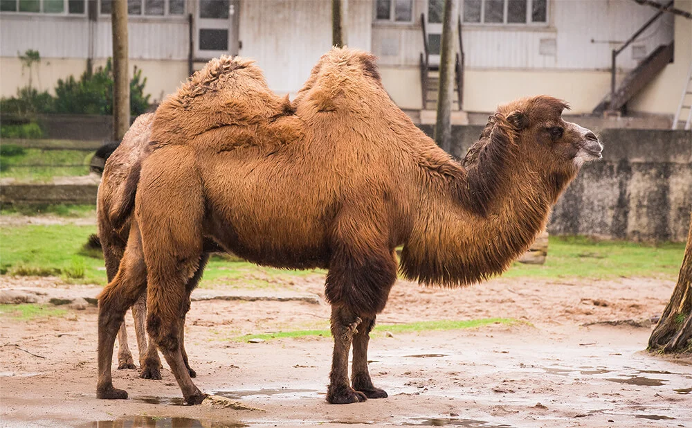 Bactrian camels in Blackpool zoo with long fur winter coat to keep them warm