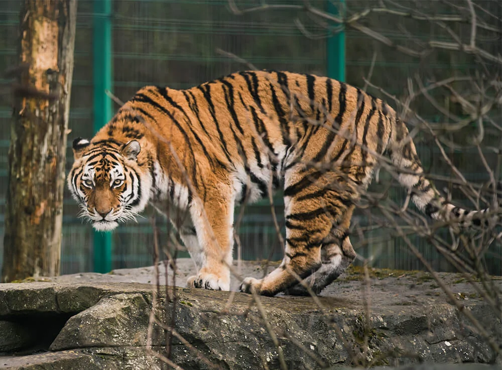 Image of an orange, red, black and white tiger stalking its prey, staring at the photographer and looking very aggressive stood on a rock in Blackpool zoo