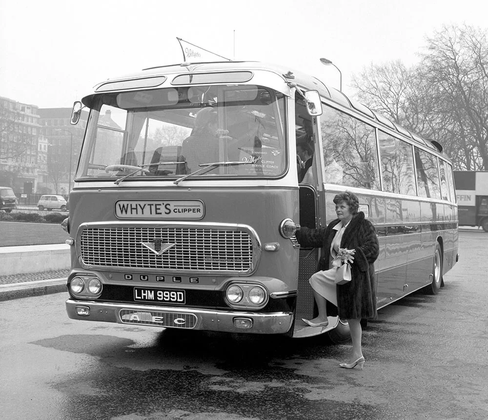 This image shows a trial run in London of Duple’s latest coach on 5 April 1966. It was described as ‘the world’s most advanced luxury coach’ and contained a dining bar, cocktail lounge, library, and toilet facilities. As well as table lamps and radio telephone equipment, there was also a hostess on duty to take shorthand and type for businessmen. Built by the Duple Group at Blackpool, it was handed over to the owners, Whytes of Edgware, in London.