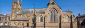 Sacred Heart Church was founded by the Jesuits as the town’s first Roman Catholic church. It was built in 1857 to a design by Edward Welby Pugin. The church was enlarged, to the east, in 1894, to a design by Pugin & Pugin. It was designated as a Grade II* listed building by English Heritage on 20 October 1983. The Grade II* listing is for “particularly important buildings of more than special interest”. Since 2004, it has been served by priests from the Roman Catholic Diocese of Lancaster. The parish priest is Canon Robert Dewhurst. The church is constructed of…