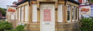 The tramway passenger shelter in St Annes, originally built in 1918, served as a waiting room for passengers of the Lytham St Annes Corporation Tramways. Constructed by the original tramway company, the shelter was located at the junction of A584 Clifton Drive North and St Annes Road West. It was later extended in 1984 and used as the Clock House Café but it is now used as a Spud Hut. The shelter features the words “WAITING ROOM” engraved above the original entrance and a later-added clock. The shelter has a “WAITING ROOM” inscription above the entrance and a later-added clock.