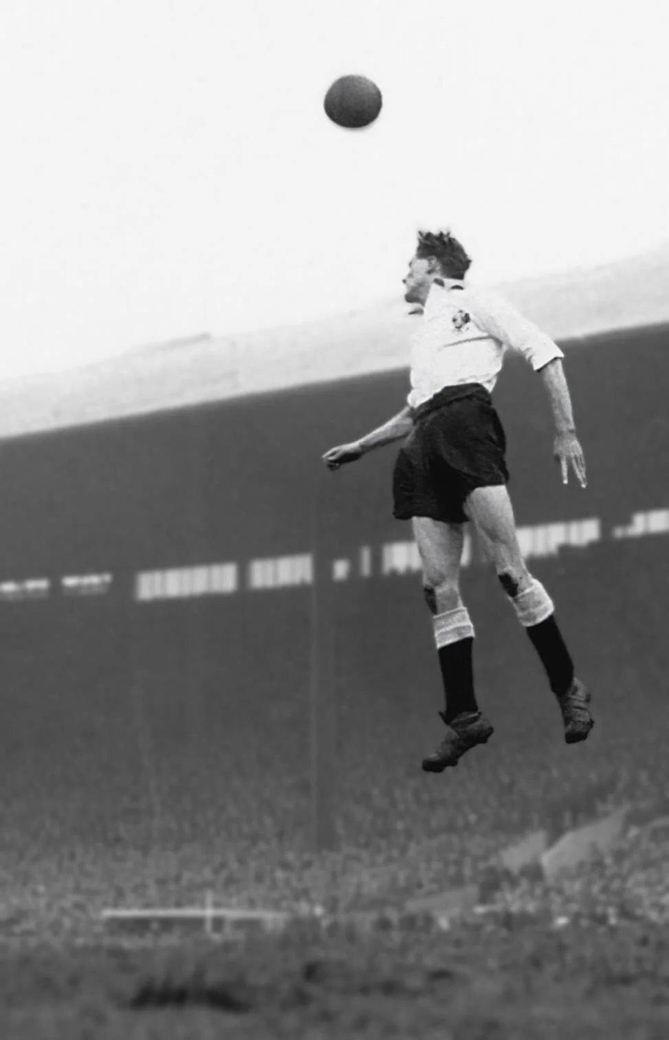 David Durie, the Blackpool inside left, heads away a Manchester United free kick during the First Division Match. 7 April 1956