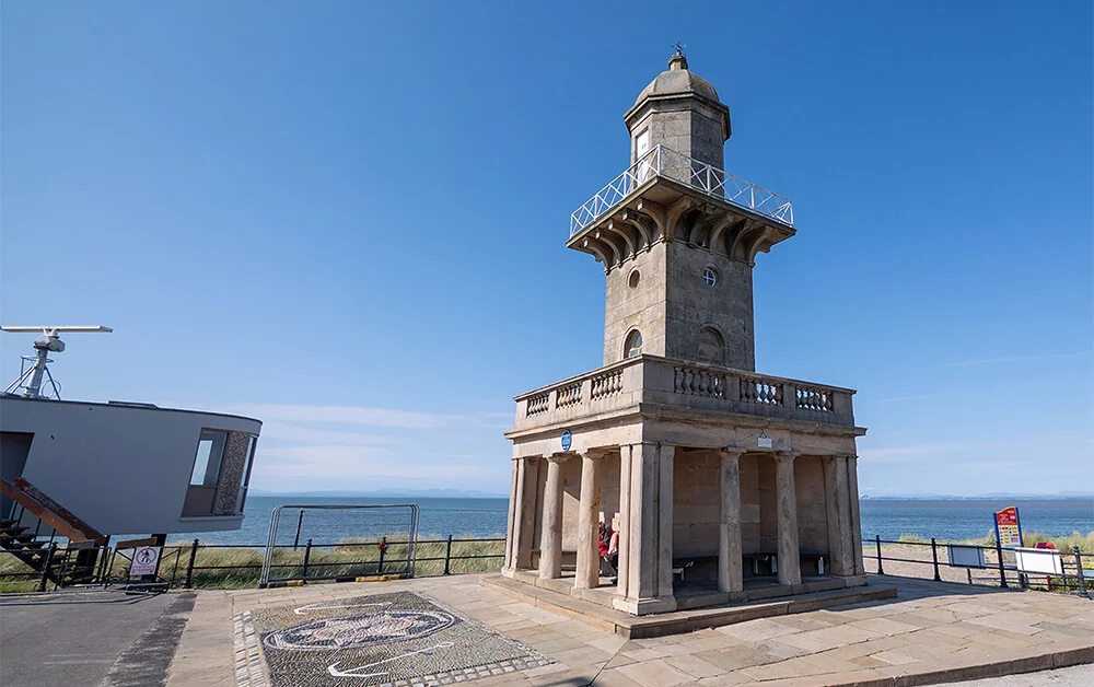 The Beach Lighthouse, also known as the Lower Lighthouse, stands on the seafront at Fleetwood, Lancashire. Rising forty-four feet in height, the sandstone structure was designed in 1839 by architect Decimus Burton in collaboration with Captain H. M. Denham, a naval hydrographer. Burton had been commissioned three years earlier by Sir Peter Hesketh Fleetwood to plan and design the new town of Fleetwood. In contrast to the utilitarian appearance of most British lighthouses, the Beach Lighthouse was conceived in a neoclassical style, featuring a square, colonnaded base, a square tower, and an octagonal lantern crowned by a viewing gallery.