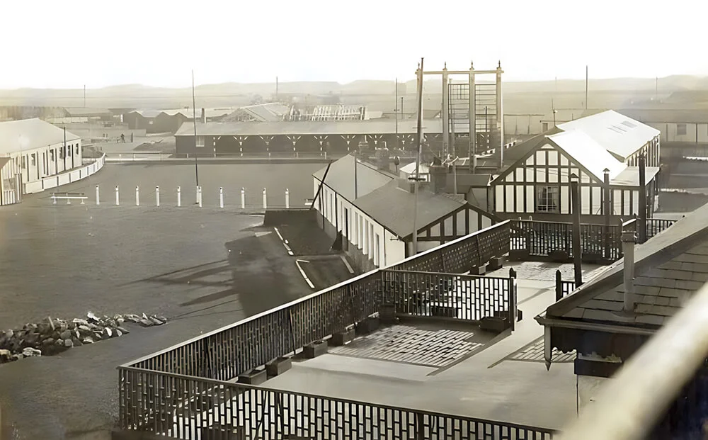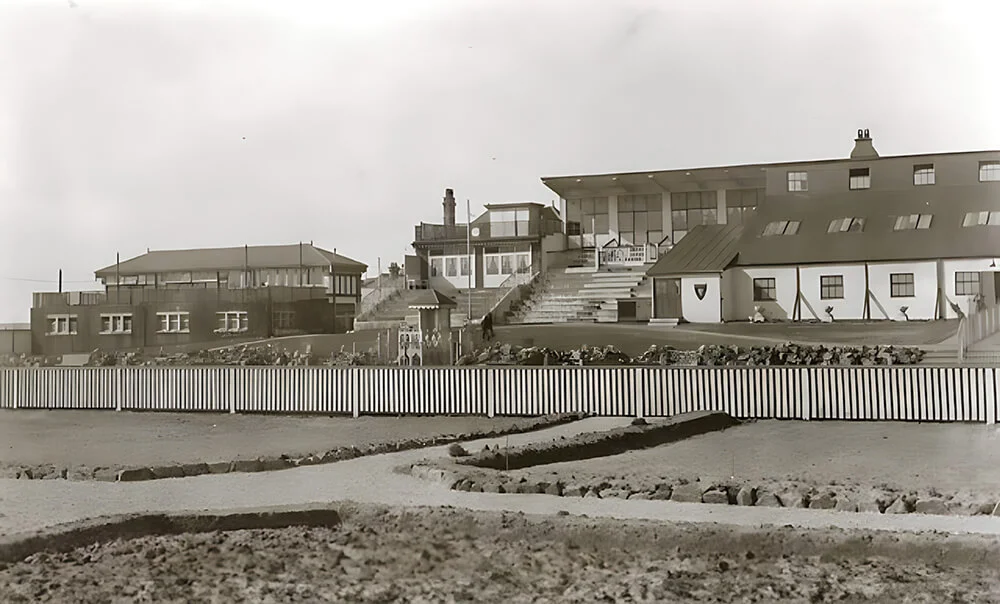 Despite high expectations, the venture struggled due to overspending on construction and prize money, combined with difficulties in attracting high-quality racing fields, leading to declining attendances. The company was forced into liquidation, and in 1916, the King’s Lancashire Military requisitioned the site, transforming it into a convalescent hospital for wounded soldiers during the First World War. By 1919, the airfield owners took over the land, demolishing adjacent huts to expand the aerodrome, although the grandstand and stables remained. The grandstand continued to serve as a rehabilitation centre until 1924, after which it was handed over to the Lancashire School of Aviation. In late 1932, Blackpool Greyhound and Racecourse Ltd initiated a five-month construction project, purchasing a small portion of the 140-acre site next to the grandstand. At the same time, the aerodrome was acquired by the West Coast Aero Club, which aimed to provide flights to the Isle of Man. The exterior of the grandstand was refurbished, while an oval greyhound track and sporting arena were built within the former horse racing course. The newly established Stadium Club and Aero Club featured offices, lounges, and refreshment facilities.
