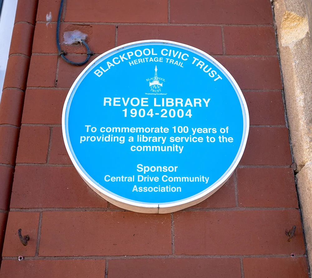 This plaque from Blackpool Civic Trust hangs outside the Revoe Library.