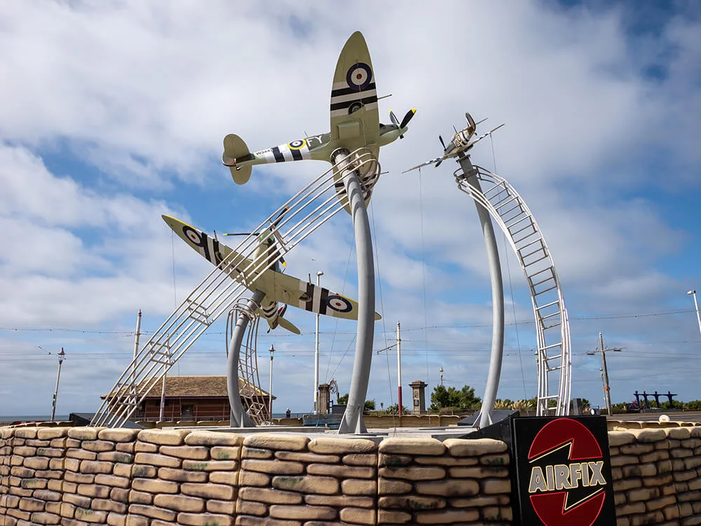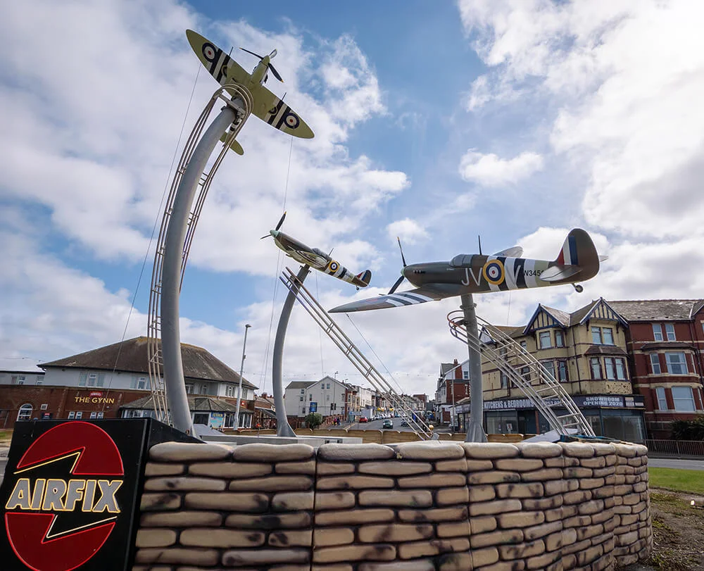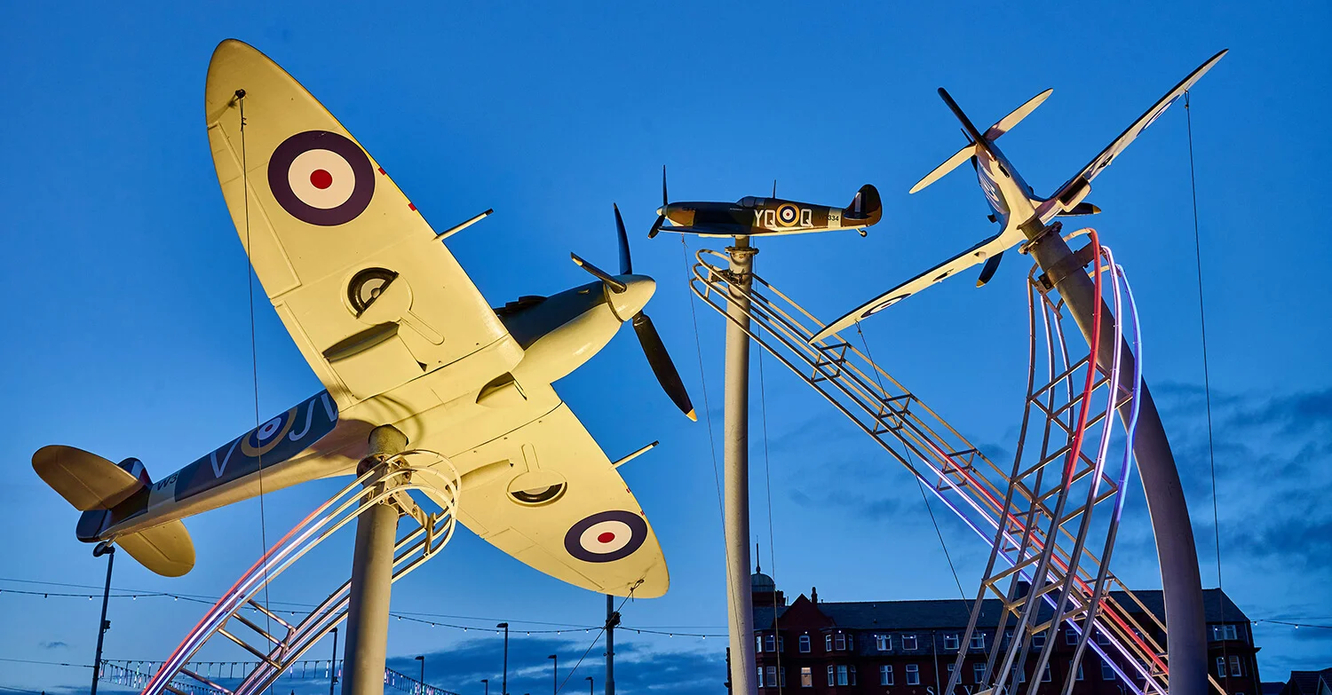Spitfire Island was one of the exciting new features of the Blackpool Illuminations 2023, which started on 1 September and ran every night until 1 January 2024. The installation was the result of a collaboration between the Blackpool Illuminations team and the renowned designer Laurence Llewelyn-Bowen. This year, the focus was on a tribute to the iconic Spitfire aircraft, with three full-scale replica Spitfires taking centre stage in a revamped display at Gynn Roundabout in the northern part of Blackpool. The collaboration also included Airfix, the famous model kit company, who sponsored the feature. It was a landmark moment as the Spitfires were created using 3D printing technology, a first for the Blackpool Illuminations. Two of the planes were previewed before the full installation was unveiled on 1 September. The planes were part of a larger effort to celebrate the area’s rich aviation history, particularly the connection to the Spitfire aircraft, which had been stationed at Blackpool Airport during World War II.