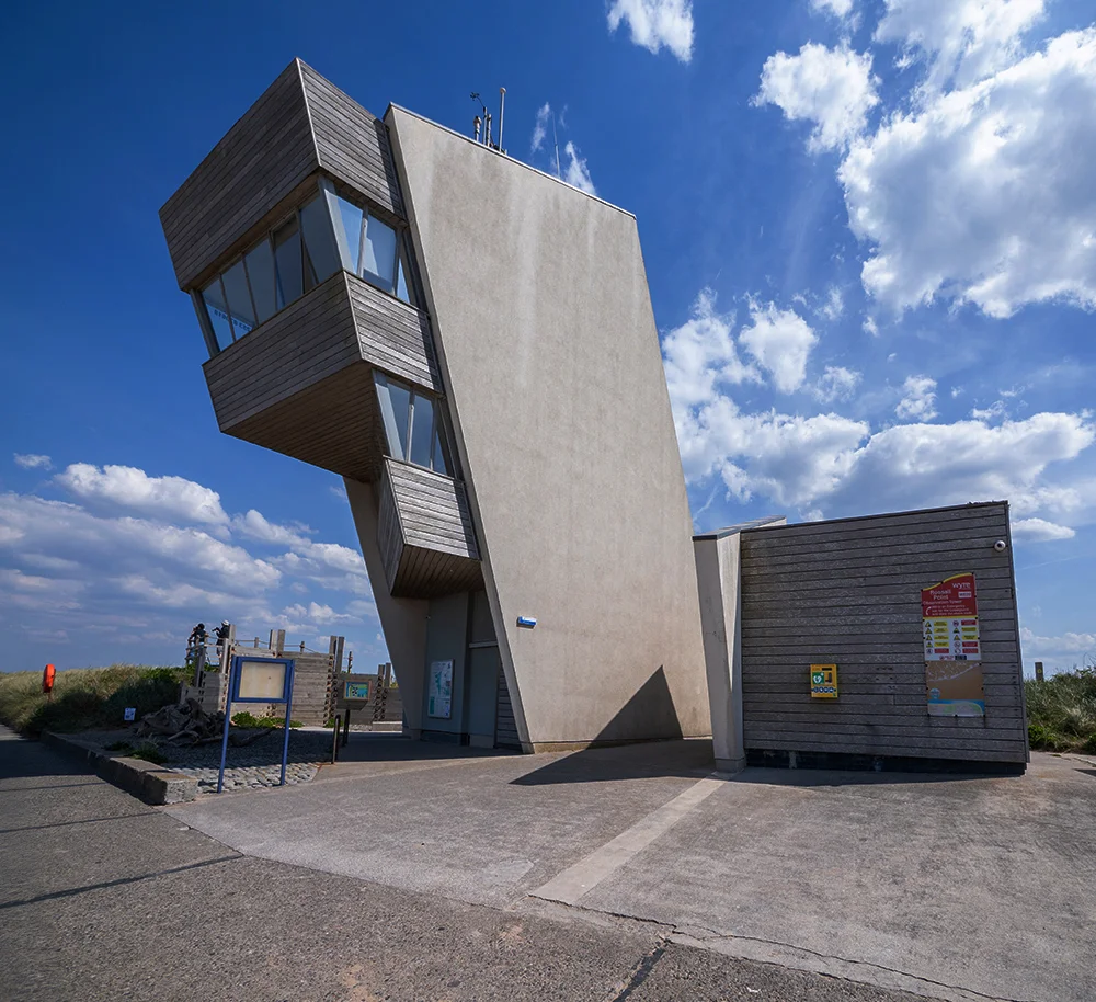 Rossall Point Observation Tower stands on the sand dunes between Cleveleys and Fleetwood, a striking four-storey structure rising 46 feet above the shoreline. Completed in March 2013, the tower serves both as a beacon and as a public vantage point. It is designed by Studio Three Architects as part of Wyre Council’s £2.1 million Sea Change programme, which aims to revitalise the coastline through investment in facilities and attractions.