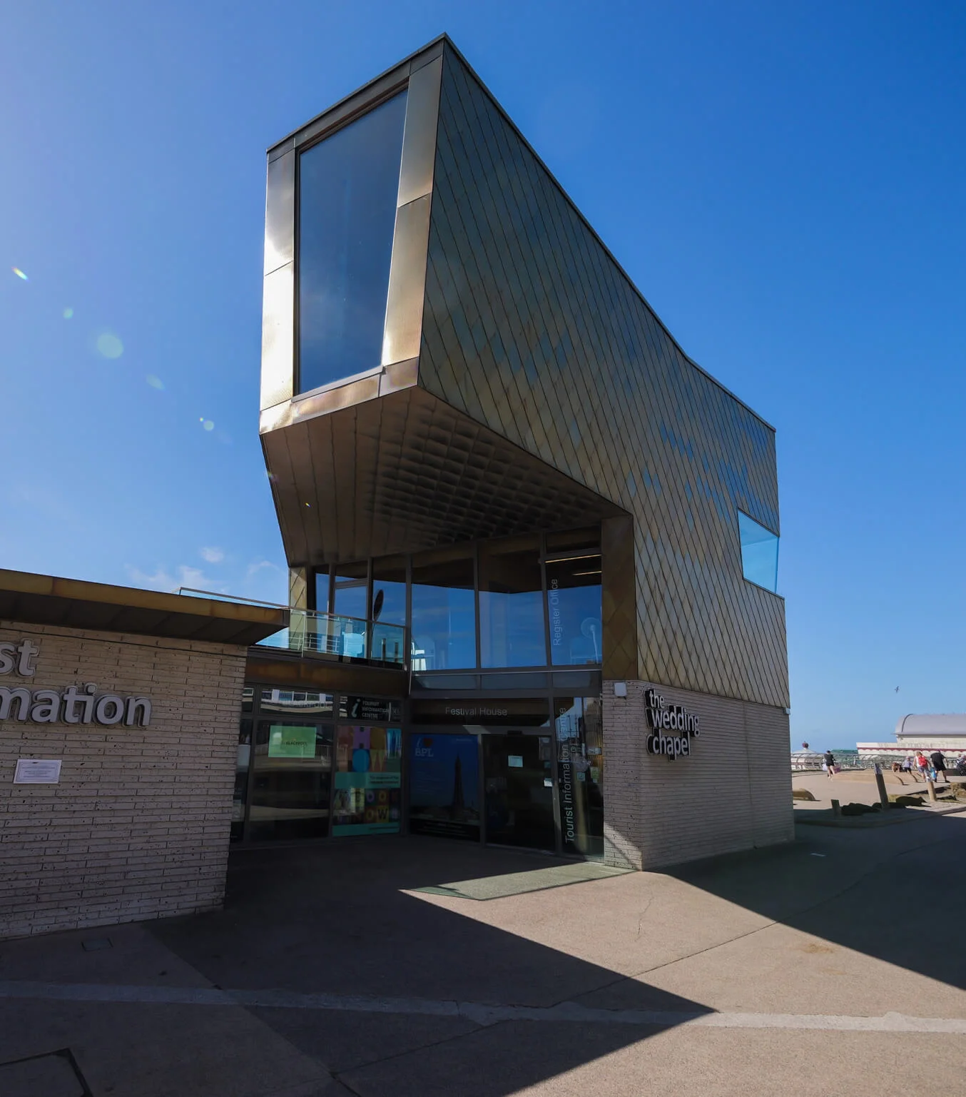 The Wedding Chapel, located inside the £2.7 million Festival House on Blackpool’s iconic Promenade has become a beloved spot for couples to tie the knot, with Kelly Goudie and Simon Garrick being the first to exchange vows there on January 12, 2012. Since that inaugural ceremony, The Wedding Chapel has hosted around 5,000 weddings, with a further 350 already scheduled for 2022, continuing its tradition as a premier wedding destination. Originally known as Festival House, the venue was officially renamed The Wedding Chapel in June 2014 to better reflect its primary function. The building itself is an architectural landmark, designed by the award-winning firm dRMM. Positioned on a stepped concrete plinth embedded with recycled and phosphorescent glass, the chapel’s design is both striking and environmentally conscious. Its engineered timber structure is clad in shimmering golden stainless steel shingles, intentionally designed to catch the eye and reflect Blackpool’s dynamic energy and coastal charm. The building serves as both a lookout point and a celebration of Blackpool’s unique seaside character, resilient weather, and vibrant atmosphere.