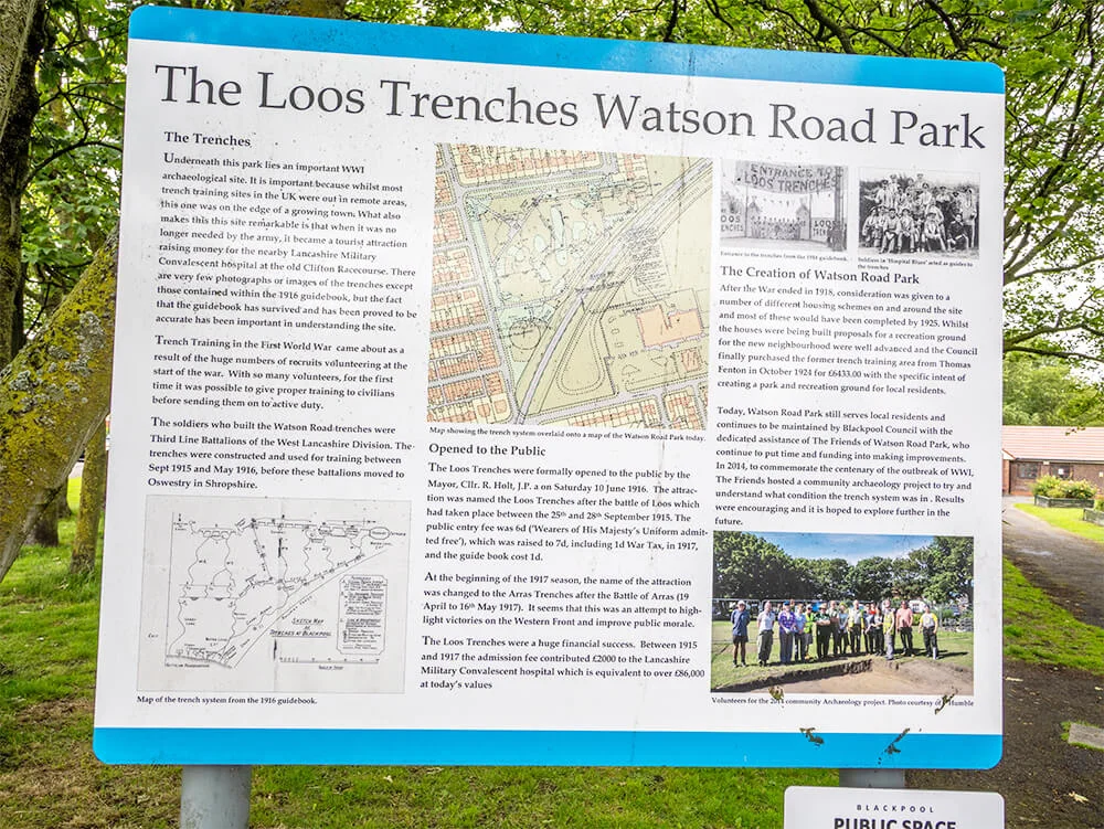 Today, the Loos Trenches remain buried beneath the park, their memory preserved through research and local heritage interpretation. They stand as a poignant reminder of Blackpool’s contribution to the Great War effort—linking the town’s history not only to recreation and tourism, but also to the training, sacrifice and resilience of Lancashire’s soldiers.