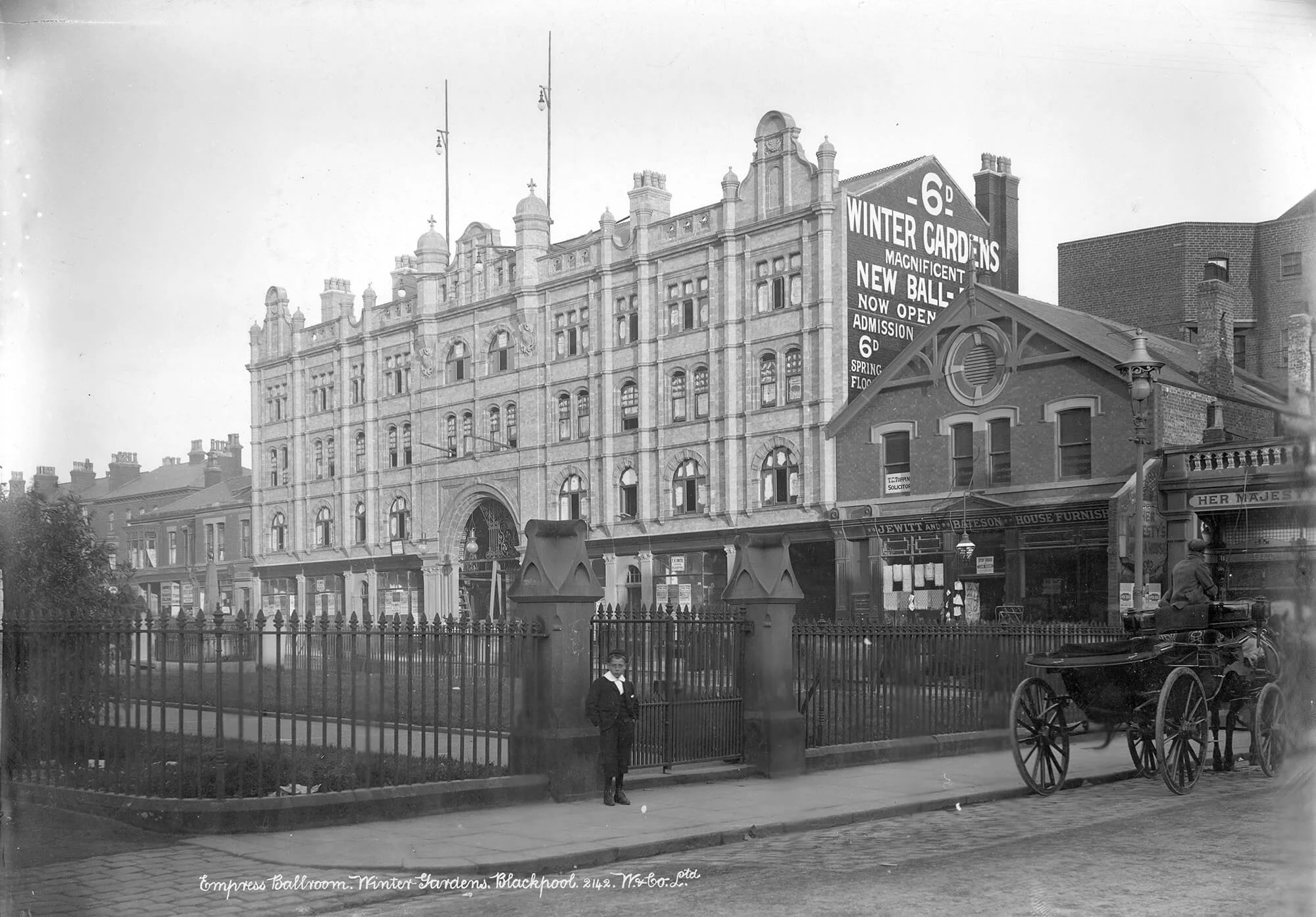 Since its inception in 1920, the Winter Gardens has hosted the Blackpool Dance Festival and has been the location for the World Matchplay darts tournament since 1994. It also annually hosts the Miss Dance of Great Britain and Dance Master UK competitions. The Winter Gardens Company acquired the site in 1875 for £28,000 and constructed the venue on the six-acre Bank Hey Estate, which officially opened on 11 July 1878. The original vision for the property included a concert room, promenades, conservatories, and other amenities designed to make the estate a pleasant retreat, especially on rainy days. During the 1870s, several parts of the venue were built, including the Vestibule, Floral Hall, Ambulatory, and Pavilion Theatre. The Opera House Theatre first opened in 1889, and the Empress Ballroom, along with the Indian Lounge (now known as the Arena), was constructed in 1896. The Blackpool Ferris wheel, erected in the same year, was also part of the complex.