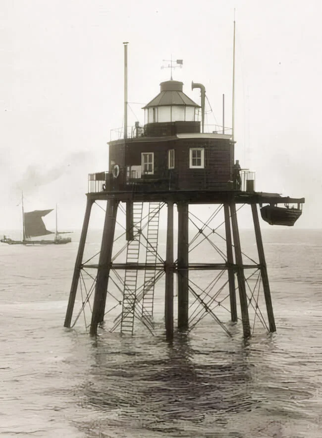 Standing on the North Wharf Bank, a sandbank defining the entrance to the Lune Deep, the Wyre Light worked in conjunction with Fleetwood’s two onshore lighthouses, the Pharos and the Beach Lighthouse, to form a navigational alignment guiding ships safely into the Wyre Estuary.